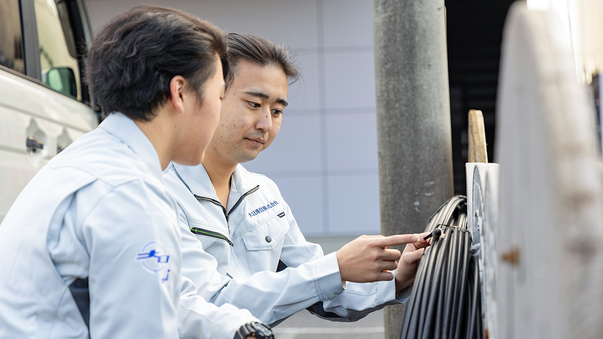 建物の構造によっては、通信線を1本引くだけでも時間がかかることがあります。天井裏に入る場合はけっこう体力を使うし、踏み抜かないよう神経を使いますね。そんな中でも、仕上がりの見栄えにはこだわっています。細い線が何本も出るより、太い線で本数を減らしてスッキリと。どうしても表に配線が出るときはカバーをつけて。一から設置する場合は、自分が納得いくよう美しく配線できるのがやりがいです。過去に当社で設置したお客様の増設工事では、事前に前回担当した先輩や後輩に事前に情報をもらうのですが、日頃から分け隔てなく話せる関係性なので気軽に聞くことができます。人間関係のよさが、仕事のしやすさにつながっていると思います。