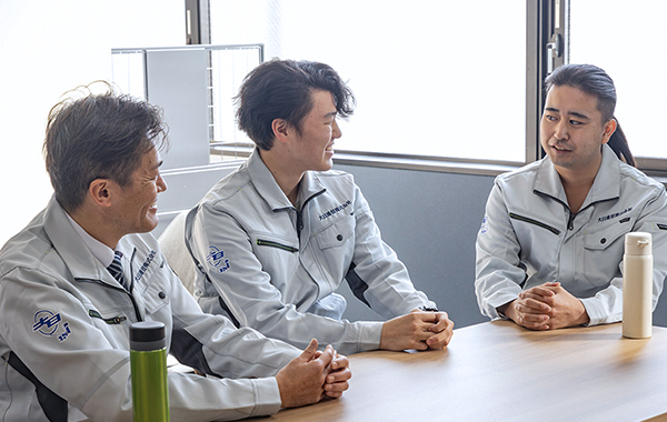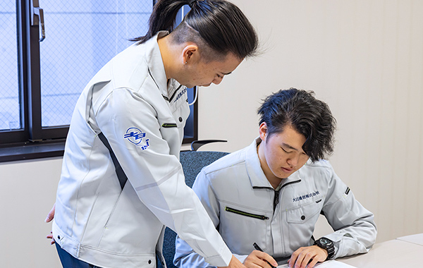 入社後は半年間の研修を用意。まず座学と現場研修で工事作業の基本を習得した後、本社の各部署でいろいろな先輩について実務を学び、幅広い分野の知識を身に付けていただきます。配属は本人の希望と適性を見て決めるので、自分に合った仕事を見つけることができます。仕事に関することは研修でしっかり教えるので、入社前に特別な知識は必要ありません。普通科出身の方や異業種から転職した方も活躍中です。